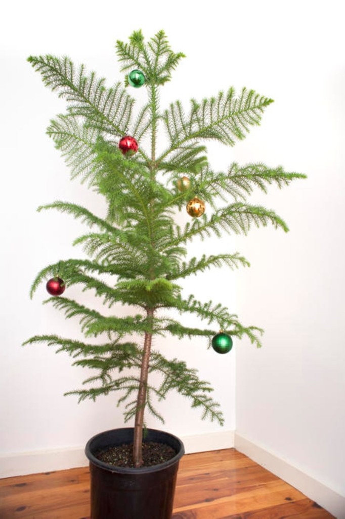 L’araucaria heterophylla n’est pas difficile à trouver. La plupart des serres la proposent, surtout à l’époque de Noël. Si vous souhaitez plus de variété dans les plantes à feuilles persistantes d’intérieur, il existe quelques autres variétés subtropicales. A. bidwillii en est une. Appelé pin bunya, c’est une version épineuse de A. heterophylla avec une forme moins bien définie. Il y a aussi Podocarpus macrophyllus, le « pin des bouddhistes », un conifère aux aiguilles longues et plates qui est particulièrement facile à cultiver en intérieur, bien qu’il puisse avoir besoin d’un peu de taille (qu’il supporte facilement) pour passer d’une forme buissonnante à une forme pyramidale d’arbre de Noël. Enfin, Hesperocyparis macrophylla ‘Goldcrest’ (anciennement connu sous le nom de Cupressus macrocarpa ‘Goldcrest’) est un cyprès doré pyramidal qui peut également être cultivé avec beaucoup de succès en intérieur et qui constitue un joli arbre de Noël.