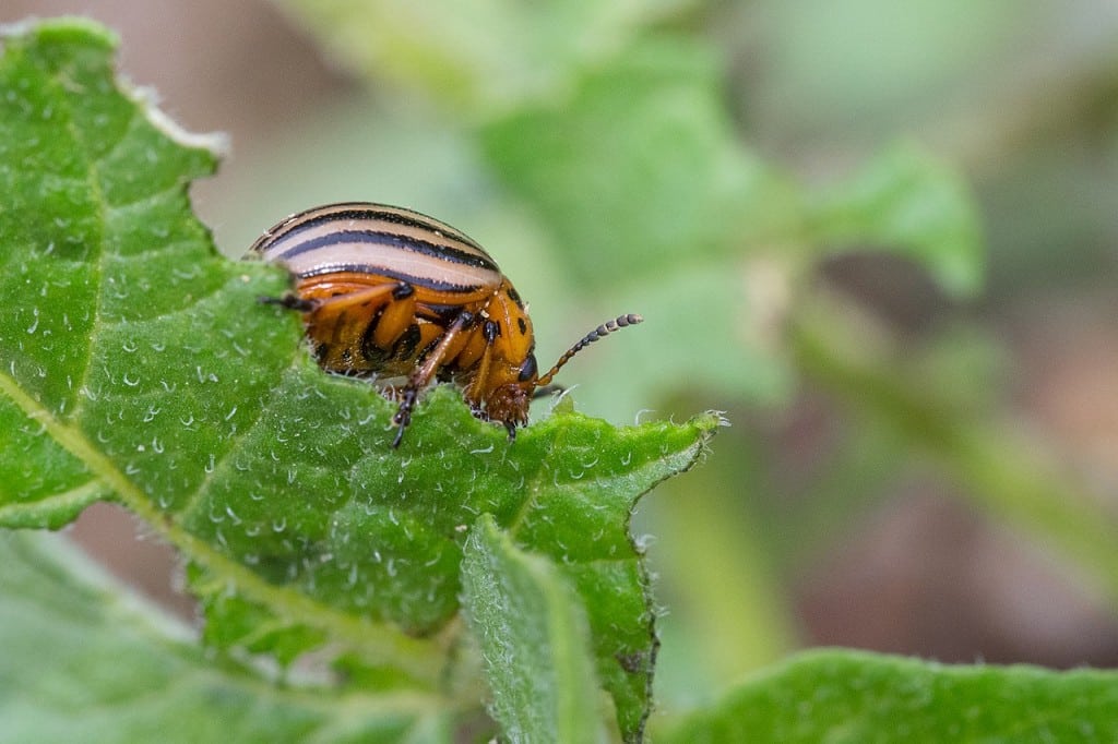 Le doryphore de la pomme de terre (Leptinotarsa decemlineata), communément appelée « bibitte à patates », est essentiellement spécifique à la pomme de terre (ou patate si vous préférez). On dit qu’il mangera, s’il faut, le feuillage des tomates, des poivrons, des daturas, des pétunias et d’autres plantes de la même famille, les solanacées, mais personnellement, en plus de 40 ans de jardinage, je n’ai jamais eu de problèmes de doryphore sur aucune autre plante.