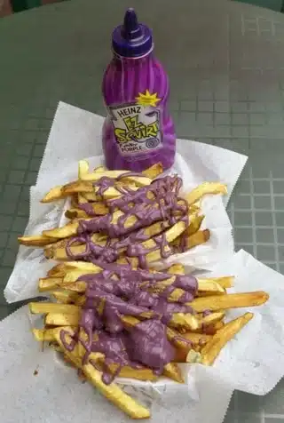 Ça me rappelle le ketchup préféré des clowns. Vous souvenez-vous du ketchup mauve? Vers l’an 2000, cette époque troublée et colorée où un clown passait inaperçu dans une troupe d’adolescentes, la compagnie Heinz avait commercialisé du ketchup violet. Heureusement, ce n’était que du colorant ajouté au ketchup rouge normal – rien à voir avec le vrai poison dans vos tomates vertes!