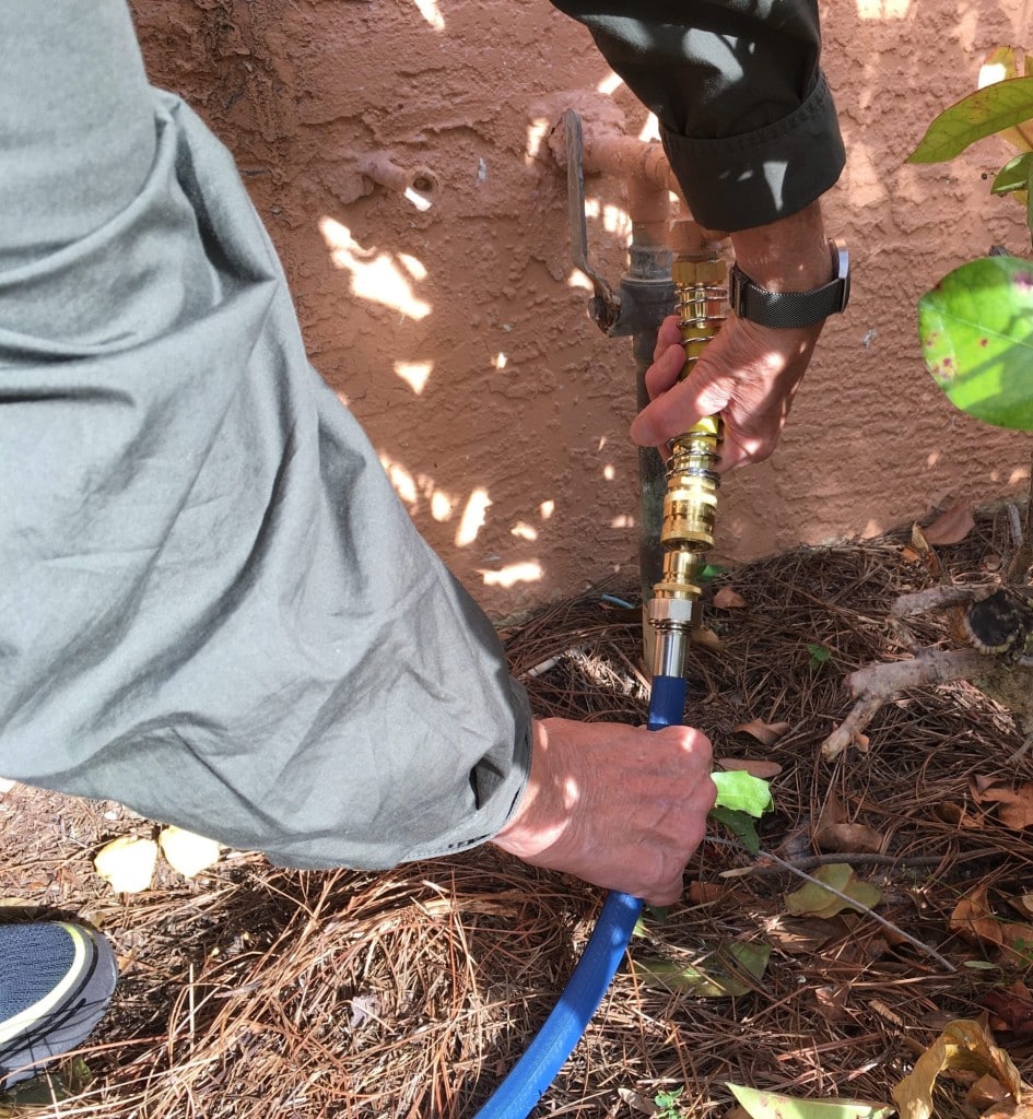Alors, chaque automne, du moins jusqu’à cette année, je me trouvais encore agenouillé, ce à quoi mon corps vieillissant s’opposait vigoureusement, dévissant avec difficulté le tuyau pour l’apporter à l’intérieur à l’abri du gel, puis chaque printemps, j’étais de nouveau agenouillé dans la boue en essayant de revisser le tuyau à cet angle ridicule avec des doigts gelés. C’était très inconfortable, mais je n’avais jamais pensé qu’il pouvait y avoir une solution facile.