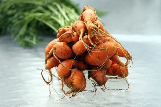 La carotte est ce qu’on appelle une plante à racine pivotante. Ce terme botanique désigne un système racinaire organisé autour d’une racine principale unique qui s’enfonce verticalement dans le sol, et sur laquelle se greffent des petites racines secondaires latérales. Ça leur donne souvent un enracinement très profond et solide. Essayez d’arracher un pissenlit sans casser cette racine et vous comprendrez tout de suite de quoi je parle. Heureusement, la carotte a été bien adaptée et sélectionnée pour la récolte, et les racines latérales sont toutes délicates.