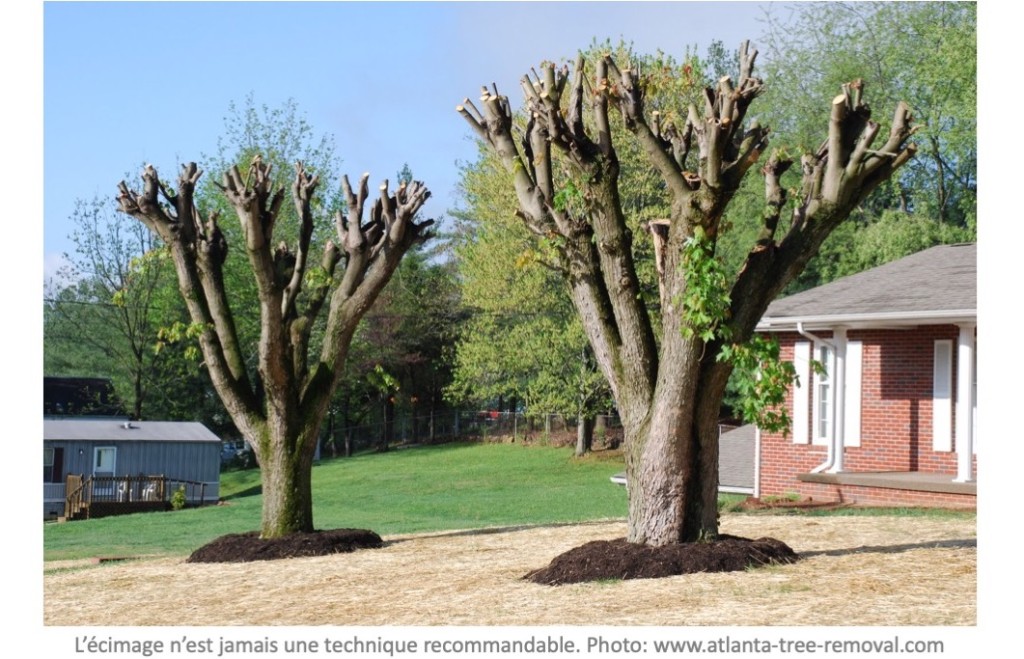 Qui n’a pas déjà vu un arbre coupé de façon radicale, avec toutes les branches à la même longueur? On appelle cela officiellement écimage ou étêtage… mais «topper un arbre» dans le langage québécois courant. Et l’arbre qui résulte d’une taille aussi sévère s’appelle un têtard (sans farce!). Il y a même des «émondeurs» (bien qu’ils ne méritent pas un tel nom) qui se spécialisent dans ce genre de taille.