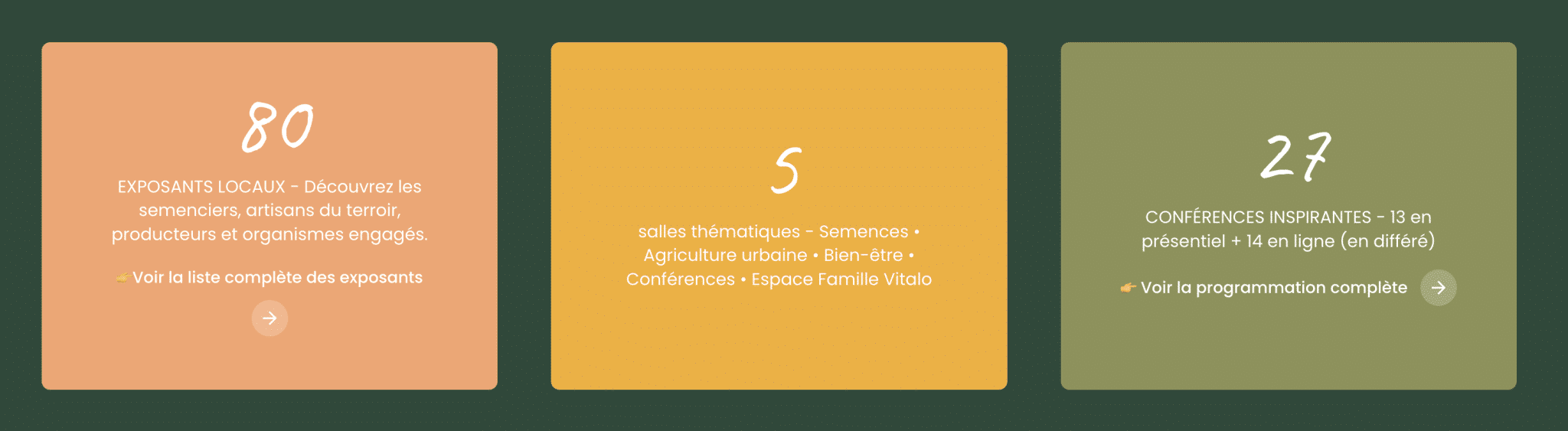 - 5 salles thématiques: Semences • Agriculture urbaine • Bien-être • Conférences • Espace famille Vitalo