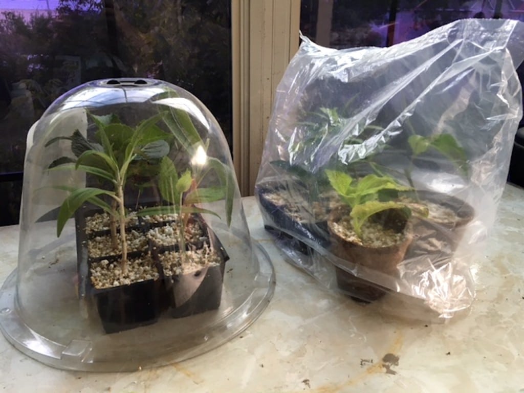 Réponse: Vous avez tout compris! Les boutures (et aussi les semis) produites par culture à l’étouffée (couvertes par une «mini-serre», soit un dôme de plastique transparent ou dans un sac de plastique transparent) s’enracinent plus facilement que les boutures faites à l’air libre, car la forte humidité à l’intérieur de la mini-serre (elle est près de 100%) élimine la perte d’eau par la transpiration. Ainsi, la bouture, n’ayant pas le stress supplémentaire de constamment chercher à remplacer l’eau perdue par ses feuilles, peut concentrer ses efforts sur la formation de racines.