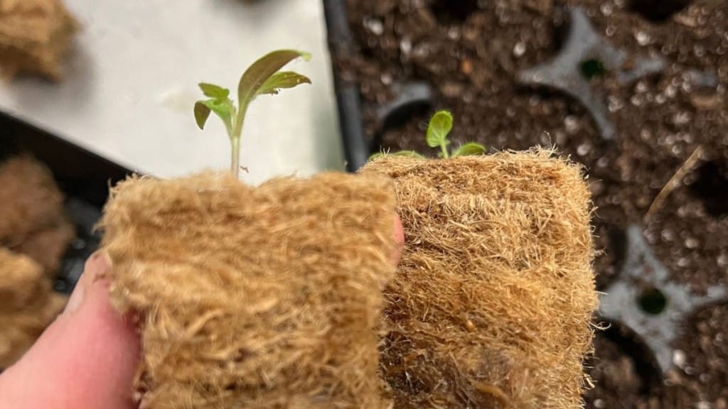 Le semis est très facile en cubes de fibres de chanvre en raison du trou prépercé dans lequel on place la graine à semer. Une fois les graines semées, on arrose les cubes jusqu’à saturation et on patiente! Selon mon expérience, l’utilisation d’un dôme n’est pas nécessaire. Les fibres de chanvre ayant une capacité de rétention de 1000 fois leur poids en eau, la fréquence d’arrosage des jeunes semis est nettement moindre qu’en terreau. Au fur et à mesure que les plants croissent, on peut ajouter une fertilisation liquide, les cubes de fibre de chanvre n’ayant pas de réserve en nutriments.