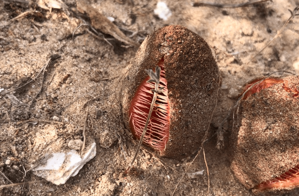 Commençons par le commencement, car aucune fleur ne fleurit sans avoir d’abord un bon apport de nutriments. Les racines d’Hydnora forment de grands rhizomes, un peu à l’image d’un gingembre… Un gingembre de quelques mètres qui ressemble de manière troublante à une colonne vertébrale! Il arrive que le sol craque sous la pression des rhizomes qui s’y cachent, et il paraît même, selon une histoire populaire dont la source reste inconnue, que cette pression pourrait infliger des dommages à des bâtiments!