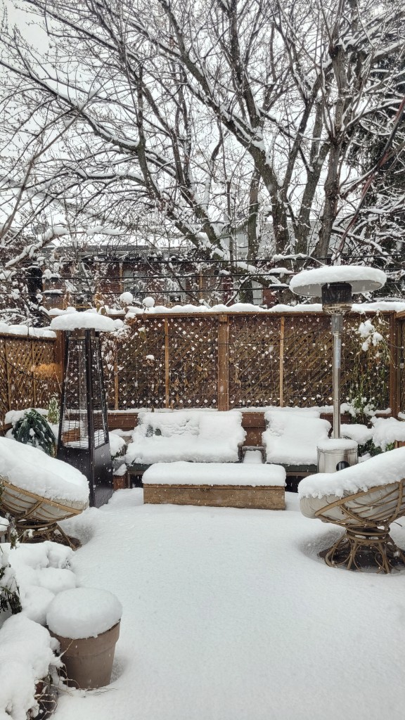 J’ai mis mes bottes (qui sont, pour vrai, doublées de mouton!) et je suis sorti voir l’état de mon jardin, qui n’est, en fait, qu’une terrasse au deuxième d’un petit immeuble : le chou kale avait gelé (pas grave c’est beau quand même!); le persil était encore vivant sous une couche de neige; et des tiges sèches pointaient par-ci par-là, signe d’un potager urbain bien rempli. Je n’avais pas tout à fait fini mon ménage d’automne.