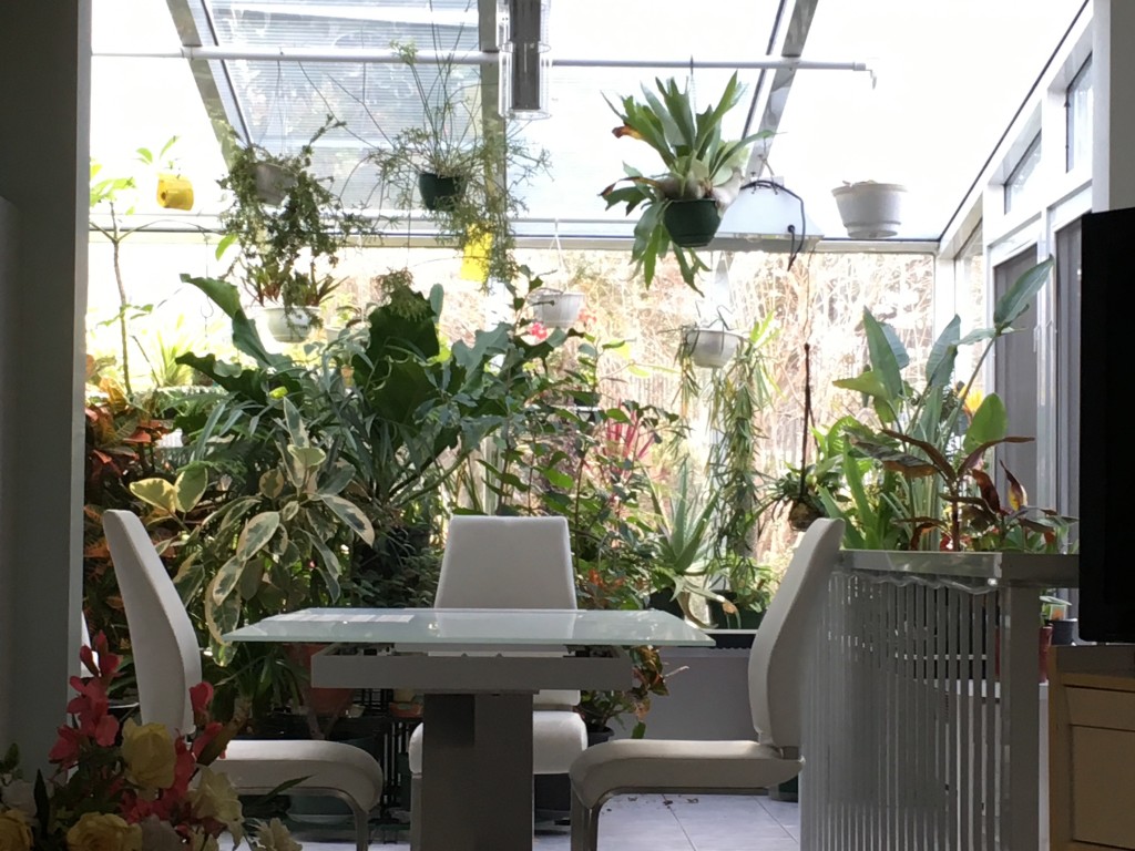 Voici ce que je vois de mon salon quand je suis confortablement étendu dans mon fauteuil inclinable. Je n’ai qu’à lever les yeux pour admirer la «serre» (officiellement un solarium), remplie à craquer de belles plantes d’intérieur. Je peux voir des mandevillas, des pélargoniums, des oiseaux de paradis, des couronnes d’épines et des cactus d’automne, actuellement en fleurs, et d’autres floraisons suivront pendant tout l’hiver.