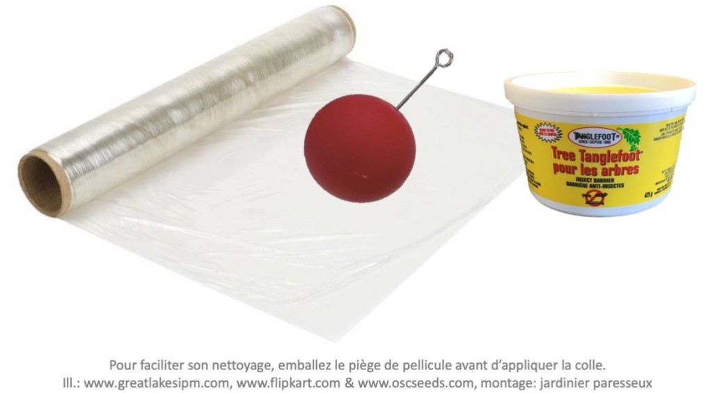 Le piège en forme de boule rouge qu’on place dans les pommiers après la floraison pour attirer et attraper la mouche de la pomme (Rhagoletis pomonella) est bien pratique. On le couvre d’une colle qui ne sèche pas, comme le Tanglefoot, et les mouches y restent prisonnières avant de pouvoir pondre sur les vraies petites pommes encore vertes.