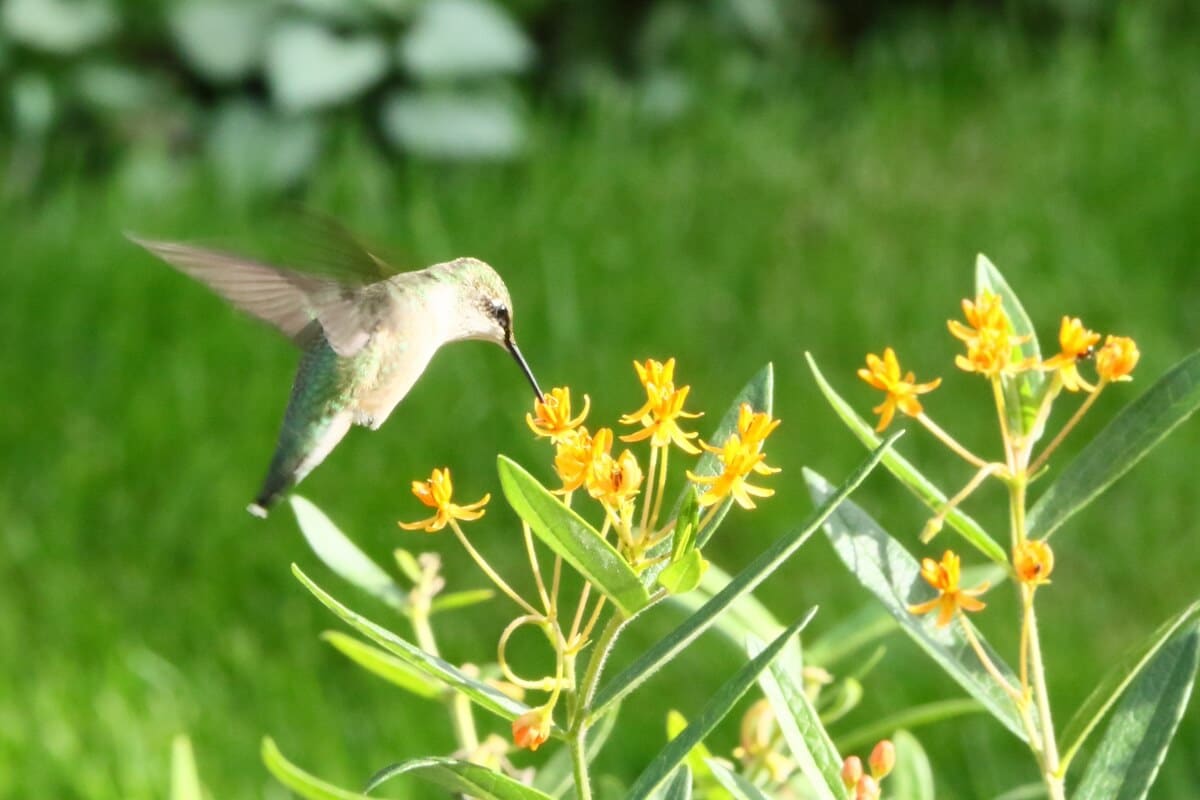 Dans ma base de données, il se trouve un grand nombre de végétaux pour cet oiseau fétiche. Certains m’ont dit qu’il y a des plantes qui ne s’y trouvent pas malgré que je les mentionne comme ayant du succès auprès des oiseaux. Voici une explication très simple: je fais encore d’heureuses découvertes que je n’ai pas eu le temps de consigner. Ainsi l’asclépiade tubéreuse (Asclepias tuberosa) qui a beaucoup de succès à la fin août, soit quelques jours avant le départ du colibri vers le sud.