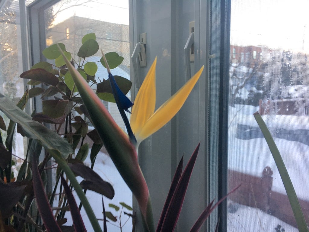 La première fois qu’une plante d’oiseau du paradis ‘Mandela’s Gold’ a fleurie chez moi, c’était en septembre 2015, 7 ans après que je l’aie semée. Non, ce délai n’est pas anormal. Même qu’il peut falloir attendre jusqu’à 10 ans avant de voir des fleurs. Et maintenant, cette même plante fleurit pour la deuxième fois, 4 ½ ans plus tard, cette fois-ci au milieu de l’hiver. Et cette fois, elle a une deuxième tige florale qui vient de s’épanouir aussi. Des fleurs successives sortiront de chaque bouton floral, ainsi la floraison s’étendra sur presque deux mois.