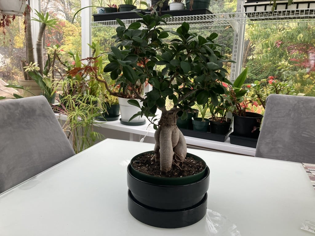 La plante en question était un «ficus ginseng», deux formes de banian chinois (Ficus microcarpa) greffées l’une sur l’autre: un clone à croissance rapide et à racines épaisses, dont le sommet des racines est exposé pour lui donner l’apparence d’un tronc torsadé multiple. Et une variété à croissance plus lente et plus dense, souvent F. microcarpa ‘Green Island’, greffée au sommet pour fournir du feuillage. On dit que l’ensemble ressemble à un bonsaï. De ce fait, le ficus ginseng est généralement commercialisé comme un bonsaï et vendu dans un pot pseudo-bonsaï constitué d’un pot en céramique avec une soucoupe assortie. C’est exactement ce que j’ai ramené du magasin IKEA local en ce jour d’hiver.