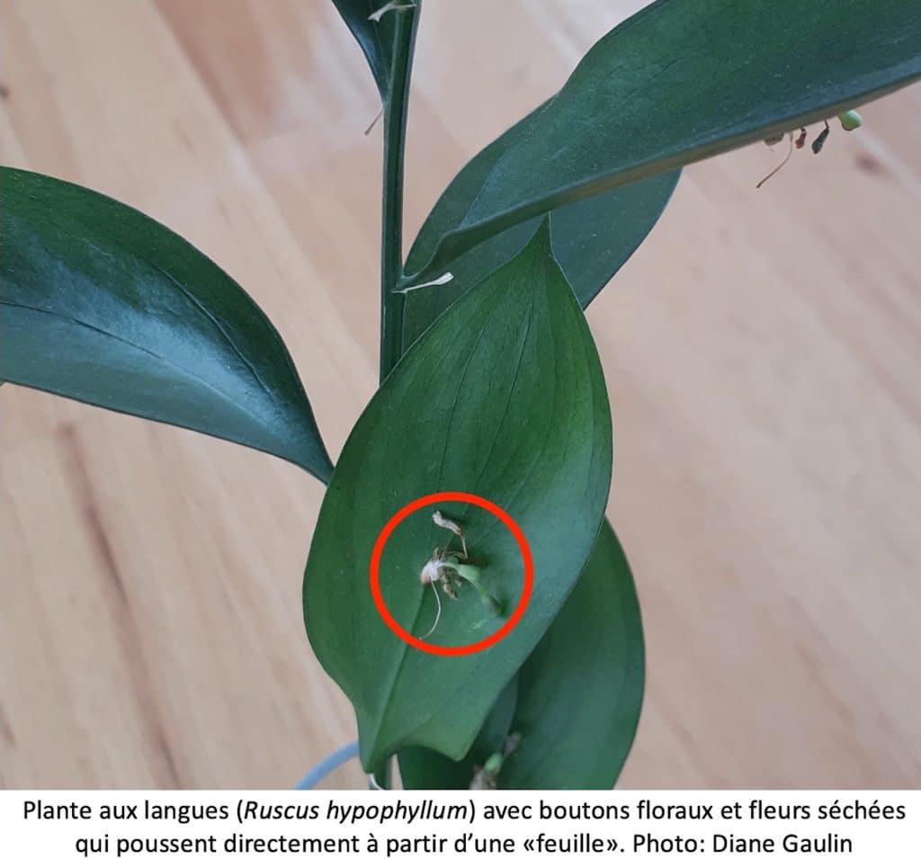 Réponse : Votre branche est celle d’un fragon (Ruscus spp.), probablement l’espèce appelée plante aux langues (R. hypophyllum), originaire du pourtour de la Méditerranée, bien que le fragon petit houx (R. aculeatus), aux «feuilles» plus étroites et piquantes, soit aussi utilisé dans les arrangements floraux. Les anglophones les appellent «Israeli ruscus» (R. hypophyllum), car les tiges sont surtout produites en Israël alors que les tiges de «Italian ruscus» (R. aculeatus) sont surtout produites en Italie. Ces tiges sont vendues aux fleuristes à travers le monde.