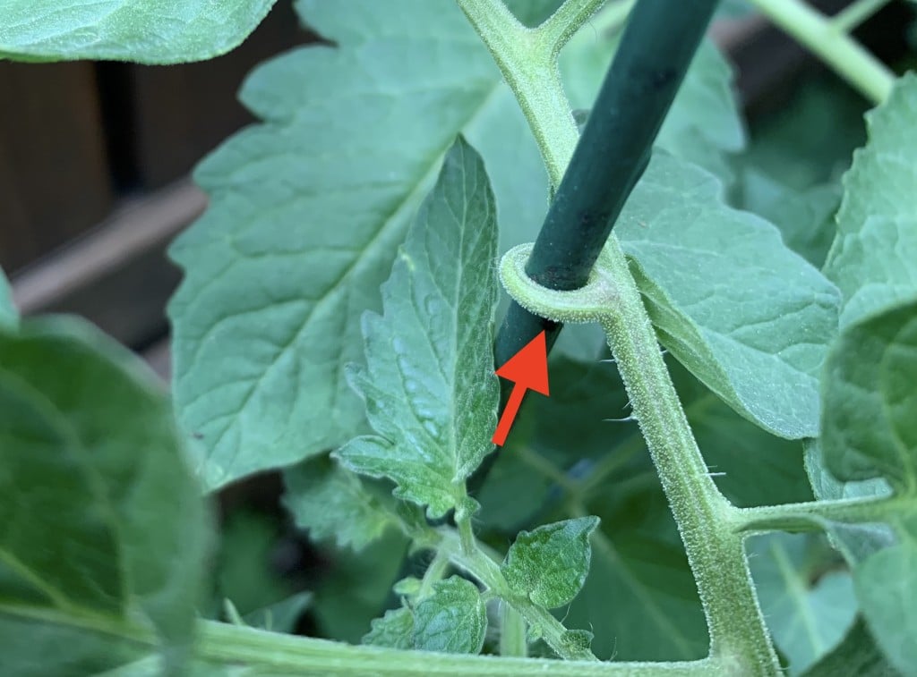 Ainsi, les jardiniers fixent eux-mêmes les longues tiges sarmenteuses de la tomate à un tuteur ou laissent la plante trouver son propre appui en se faufilant à travers le grillage d’une cage à tomates. Je n’ai jamais entendu parler d’une tomate avec un pétiole qui s’enroule sur son support et croyais cela impossible. Jusqu’à ce que je le voie dans mon propre jardin!