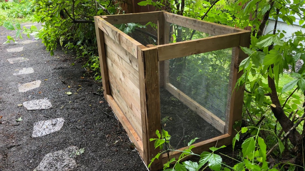 Alors, pour ne pas jeter les feuilles que j’avais en trop, j’ai décidé de les entreposer pour les utiliser plus tard. Pour que les feuilles restent en place et garder le jardin propre, j’ai construit une boîte à feuilles avec du bois traité et un treillis métallique. J’ai acheté le bois, mais j’avais déjà du treillis qui traînait dans le sous-sol.